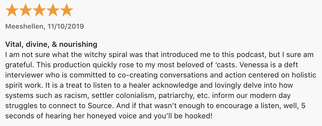 This podcast has hands-down changed my life. I am living in alignment with my purpose because of her work, Akashic readings and the podcast. Venessa’s messages & conversations are exactly the medicine we need!”